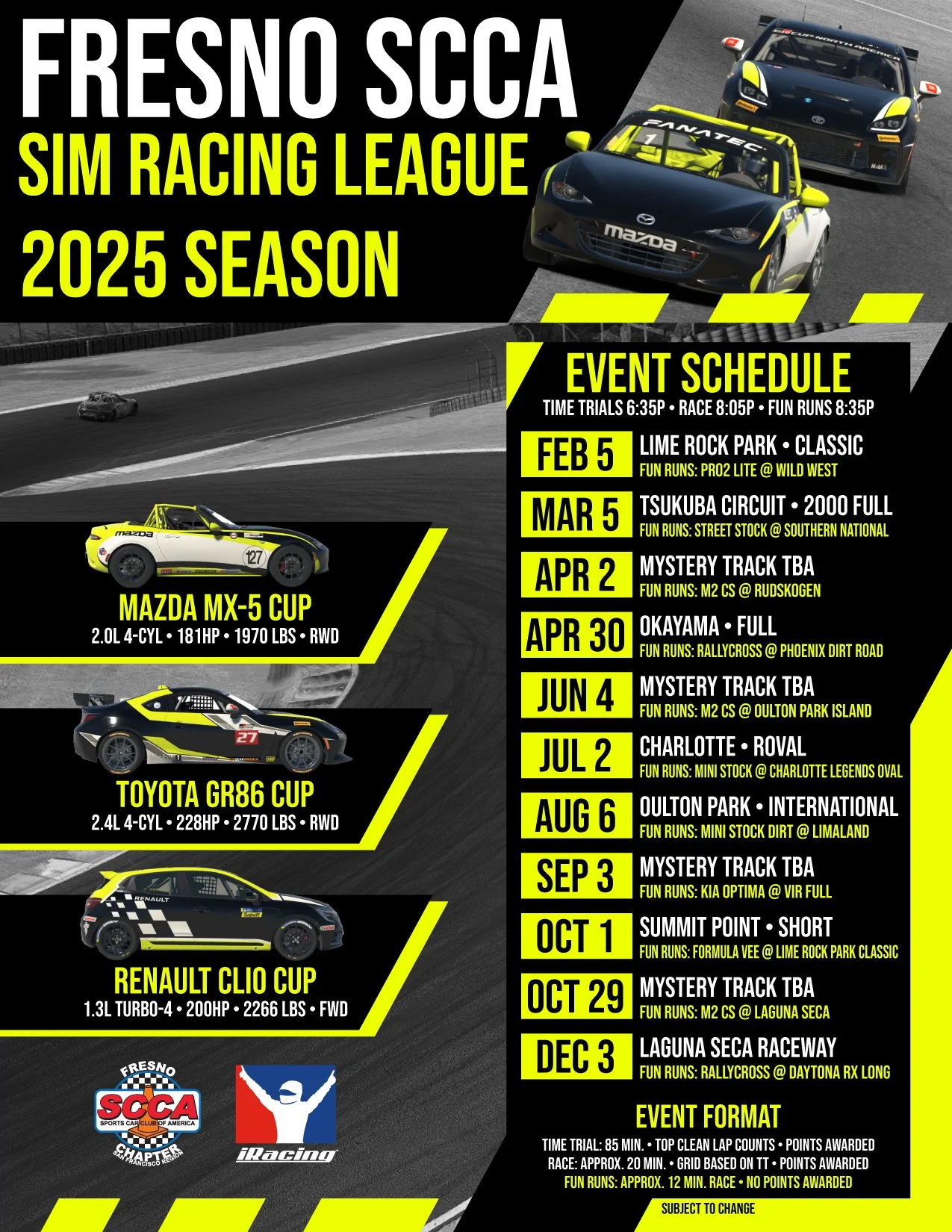 Sim Racing 2025 To join, open iRacing, click the league tab, then click FIND A LEAGUE and search FRESNO in the search box Official Rules Results Click Here to Join the Conversation on Discord