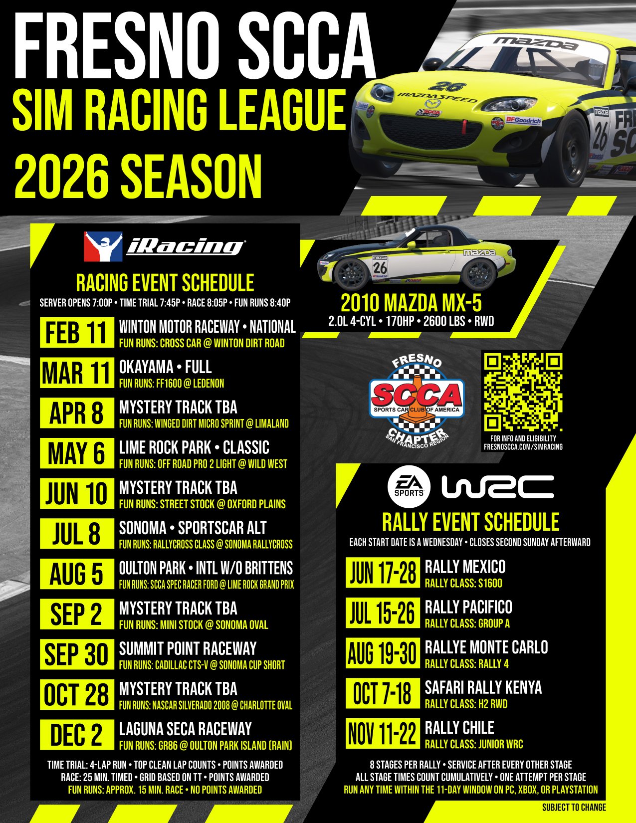 Sim Racing 2026 Join the iRacing league: CLICK HERE, then "Find A League," search for FRESNO Join the iRacing league: CLICK HERE, then "Find A League," search for FRESNO Join the EA WRC club: CLICK HERE and log in with your PSN, XBOX, or Steam ID Join the EA WRC club: CLICK HERE and log in with your PSN, XBOX, or Steam ID Official Rules Official Rules Sim Racing League Results Sim Racing League Results Sim Rally Club Results Sim Rally Club Results Click Here to Join the Conversation on Discord Click Here to Join the Conversation on Discord